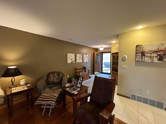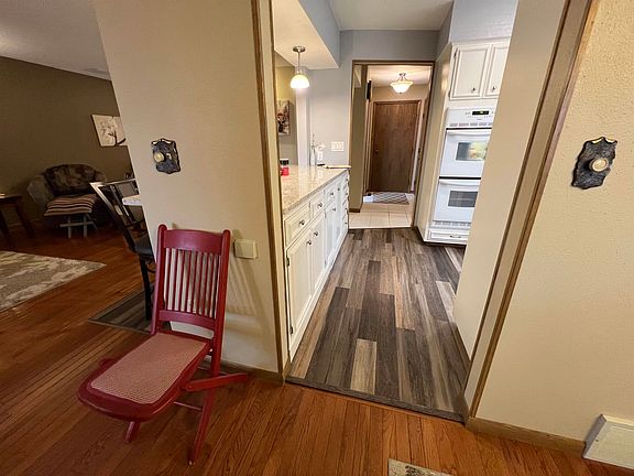 Condo in NW Minot - across the street from Vardon Golf Club.   Almost 3000 sq ft, 3 levels, 2 wood fireplaces, 3 bedrooms, 2 living rooms, 4 bathrooms, oversized double garage, large deck. UPDATE LIST: Kitchen and island countertops upgraded to granite, stainless steel appliances, laminate floor in kitchen and LL living room, primary bedroom has updated laminate floor, along with its ensuite bath getting a make-over with new sink and granite countertops on both vanity and make-up counter, along with a newer tiled shower with glass door.  Laundry room was moved from basement to upstairs walk-in closet.  Carpet updated on stairs in the last few years.