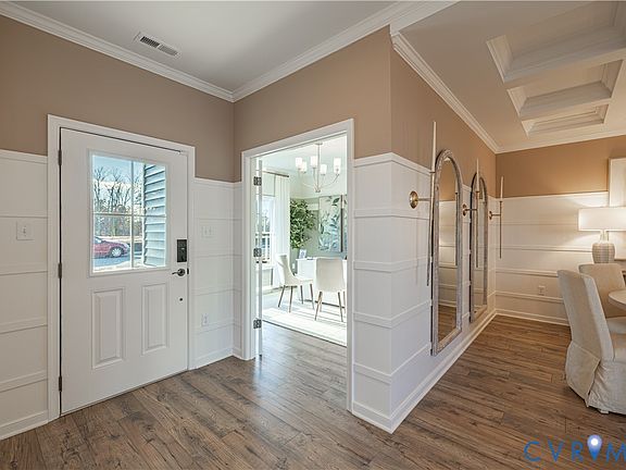 The Villas at Swift Creek is a 55+ community offering low-maintenance living in Chesterfield. This Augustine floor plan includes a study off the foyer and a dining room with a coffered ceiling detail. The kitchen features GE appliances, granite countertops, and a tile backsplash, opening to the family room with built-in bookcases and a fireplace. The first-floor primary suite offers a tray ceiling, spacious walk-in closet, and bath with dual vanities and a curbless shower. A guest bedroom and full bath are also located on the main level. Upstairs, a third bedroom and full bath are finished for additional living space. A private courtyard and 2-car garage complete this quick move-in home. For a limited time, new contracts at The Villas at Swift Creek are eligible for a $10,000 incentive.