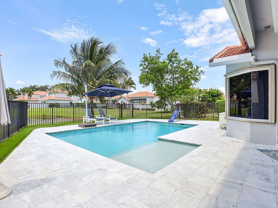 COURTESY OF Campbell&Rosemurgy Real Estate Welcome to Newport Bay Club, an exclusive gated community in Boca Raton. This spacious 4-bedroom, 2.5-bath waterfront pool home boasts a split floor plan with oversized bedrooms, soaring volume ceilings, and modern smart home features. The primary suite offers serene lake views, a built-in desk and dresser, a cozy sitting area, a large walk-in closet, soaking tub, and separate shower. Three additional generously sized bedrooms share a beautifully updated full bathroom. The heart of the home features a centralized kitchen designed for entertaining, complemented by a formal dining room, great room, eat-in kitchen nook, and a convenient cabana half-bath. The oversized two-car garage includes epoxy flooring and built-in storage solutions. Outside, enjoy year-round living with a heated saltwater pool, temperature-controlled travertine pavers, retractable screened patio, and an outdoor showerideal for relaxing or hosting guests in style.