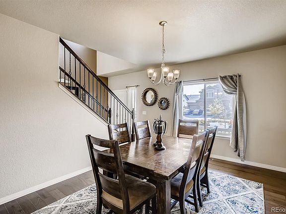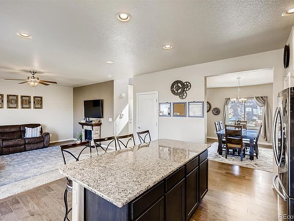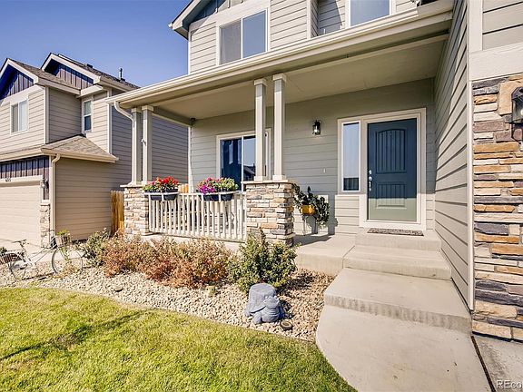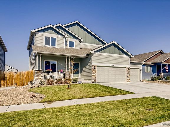 Don't miss out on this charming home with 4 bedrooms on upper level, upgraded finishes and a car lovers dream of an attached 4 car garage. From the moment you see this home you are greeted with an inviting front porch. The entry way creates privacy from the front of the home for both the kitchen and family rooms. The large open kitchen features espresso stained cabinets, granite counters, stainless steel appliances, wood floors and pantry. You can enjoy a cup of coffee at the kitchen island or add a breakfast table/eat in kitchen. Sliding glass doors to backyard flanked with windows along the backside of home, gives great natural light. Family room is large and is great for relaxing back on the couch or gatherings. Main floor also features dining room with wood floors. This space is great for hosting holidays or make into a home office/2nd sitting area. Upstairs is the master bedroom features vaulted ceilings, and spa like 5 piece master bathroom. Master bathroom has granite counters, soaking tub, walk-in shower with tile and decorative tile on the walls. Huge walk-in closet with shelves and shoe rack. Upstairs you will also find an additional 3 bedrooms and laundry room. Basement has started the process of being completed, future owner can complete space to add rec room (framed wall already has insulation from future bedroom for sound control and has wiring for entertaining components), future bedroom can be completed to turn home into 5 bedrooms, rough-in in basement. The 4 car attached garage has a 3 car front, and 1 car tandem. Currently tandem garage is a craftsman's dream with shop tables and storage shelving that will remain with home. Garage is total of 820 sqft. The backyard is great for hosting with 24x10 concrete patio, patio has tube to add future lighting on patio. This home backs to community open space which adds privacy and has a lot of extra parking behind home. Walking distance to community park and Carbon Valley Rec Center (less than 1/2 away)