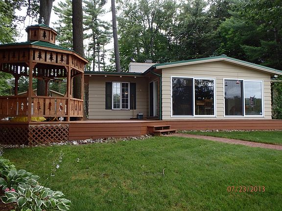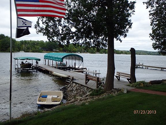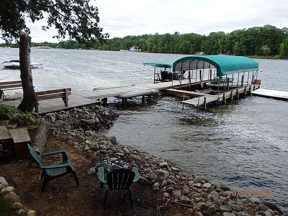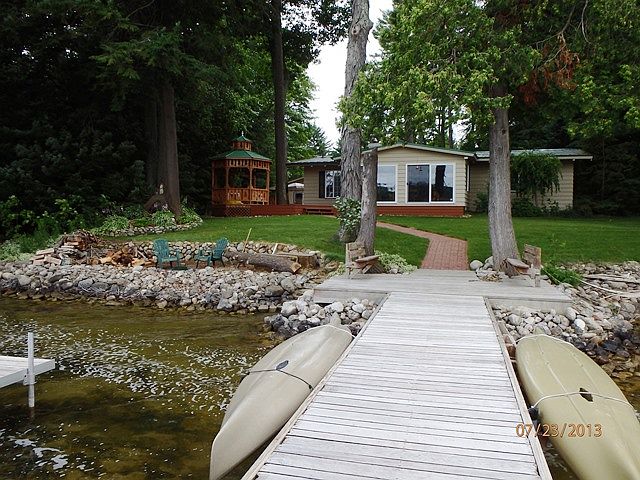 Lakefront year-round home awaits your enjoyment in the middle of Northern Michigan water wonderland beauty. You are minutes by boat through Clam River, by the Dockside waterfront restaurant and two marinas to legendary blue Torch Lake. Jump off your dock into your boat and you’re off to explore this chain of lakes from the Village of Bellaire to Elk Rapids. The prime location offers 100’ of pristine lot-width, dock length sandy swim frontage and fabulous sweeping views. This 3 bedroom, 1-3/4 bath home offers a large living room with a natural gas insert wood fireplace facing the tile floored sunroom that gives a 180 degree view of the water. Kitchen island accommodates two or more eating positions. Three sides of decking surround the home offer a cool lake breeze, or protection from a stiff breeze, regardless of the wind direction. Cedar gazebo allows a 270 degree socializing view on the corner of approximately 1200 Sq. ft. of Cabot stained wood deck. The oversized H-shaped cedar dock has a 25 x 9 ft. main slot with arched canopy, side located Shorestation brand lift with 24 ft. canopy for antique or fishing boat, dual wood slings on the dock sides for kayaks or canoes. The oversize 2-car garage has full size electric overhead doors at the edge of the large outdoor concrete pad, at the other end the garage has an 8 ft. opening connected to the finished areas with drop ceiling. This combination garage / living space building is separate from the main home and works great for isolation from noisy hobbies and/or night owl kids/grandkids. Underground yard and flower garden computer controlled sprinkler system. Both buildings have professionally wired security systems and high speed cable internet circuits. ©2016 SCS,LLC