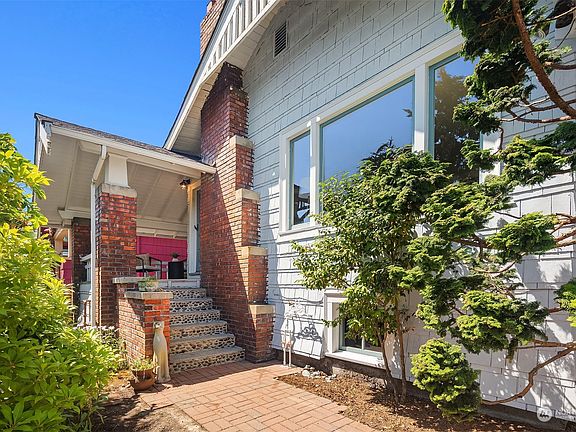 Perched above the street, this charming bungalow is ideally situated for exploring Phinney Ridge, Greenwood, and Green Lake. The spacious formal living & dining rooms feature high ceilings & beautiful vintage elements such as stained glass windows, antique lights, solid wood doors with crystal doorknobs, leaded glass built-ins, & fir floors. The kitchen,  includes tile counters and new SS appliances, with access to the backyard and patio. This lovely home also offers two bedrooms, one with French doors, & a remodeled 3/4 bath with heated floors and a walk-in shower. Outside access to the basement offers potential for an ADU. With a Walkscore of 89 all amenities are minutes away, including the Phinney Neighborhood Association.