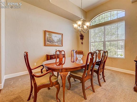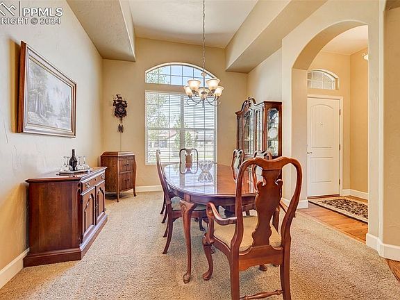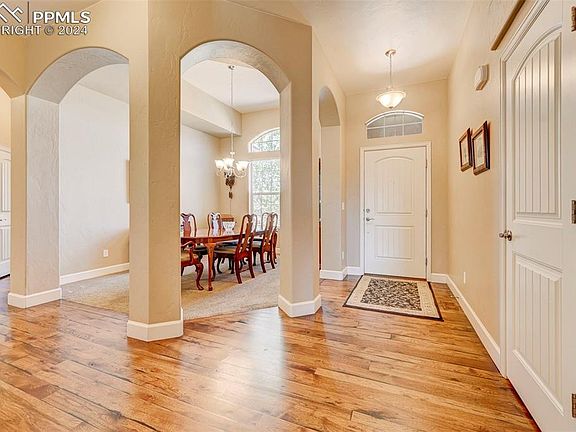 Well appointed on a west-facing corner lot offering majestic views, and sparing no custom upgrades, this open concept floor plan offers timeless finishes coupled with a functional design, providing main level living at its best! Upon entry your attention will be captured by beautiful hickory wood flooring, 6" baseboards, archways gracing the formal dining room, 10ft ceilings and hand-troweled walls and ceilings throughout; detailing the craftmanship of this incredible home! The generous great room shares a double-sided fireplace with the sunlit office and opens to the kitchen that is complimented with a gas cooktop, wall convection oven, stainless steel French door refrigerator, granite counters, breakfast bar, and ample counter and cabinet space in addition to the center island and pantry. A separate breakfast nook walks out to the lovely back yard sanctuary enhanced with expertly crafted landscaping, a patio, shed, privacy fencing, and a terraced stone fire pit with unobstructed views of Pikes Peak! The main level is rounded out with the mud room off the garage, an additional bedroom and full bathroom and the extensive primary ensuite that includes a soaking tub from which you can marvel at Pikes Peak! The basement is comprised of two additional bedrooms, both with walk-in closets, and another full bathroom. Plumbed for a wet bar, the extra spacious recreation area offers multiple opportunities for entertainment. Currently utilized as a workshop, the flex room is equipped with a dedicated circuit, 220 outlet, a sink, and provides a substantial space tailored to suit you. Complete with central air conditioning, a passive radon mitigation system piped in prior to the basement floor being poured, sound deadening added between floors, an automatic sprinkler system, an oversized garage with an extended third bay and service door, and a NEW roof in 2016, all this home needs is a NEW owner.. and that should be YOU. Welcome Home, Your Search is Over!