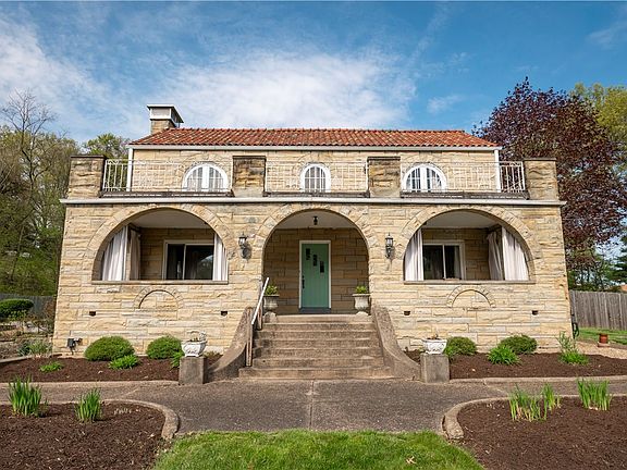 This Distinct 1950's Italian Inspired Stone Home is perfectly positioned above Verona Road. The exterior beams with character from the moment you arrive. The multicolored tile roof, stunning front porch, beautiful gardens and raised planting beds, fully fenced level back yard and covered back patio are impressive. The interior greets you with an amazing staircase featuring iron railings. The living/dining spaces are welcoming and bright w/hardwood floors and room for entertaining. Let's not forget the fully equipped kitchen with Saltillo floor tiles and space to create culinary delights! A home office and 1/2 bath complete the 1st floor. The 2nd floor features 2 sizable primary bedrooms, an open air balcony - easily accessed from the hallway, 2 additional bedrooms and a full bath. Now to the lower level! Highlighted with a comfortable space to relax and watch TV, a bar area to gather with friends (complete with a sink and beverage cooler) and extra space for a home gym and storage.