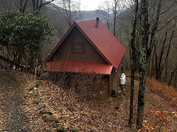 Classic A Frame Chalet within gated Wolf Laurel Community situated on unique rare double lot on over 2 Acres w/ creek & mountain views in a very private setting, wrap around composite deck. Living room features open beam, T & G Ceiling , stone hearth & wood stove, 3 inch White Oak flooring, & DBL French Doors w/ full glass, to deck. Galley style kitchen has updated ceramic tile floor and shiplap ceiling. The main level has the master suite with fully remodeled master bath. Loft level currently functions as bedroom w/ 2 queen beds & half bath. Newly added 2018 improvements adding significant value include: -Completely remodeled master bathroom, -Brand new ceramic floor tile in hall and kitchen -Newly retreaded wood stairs, -Addition of propane central heating (for now year-round use) -New stacked Samsung full size washer & dryer, -New dishwasher -6 person hot tub It has a crawl space/basement spanning the length of the home with 1/2 of the area tall enough to stand up. Currently used for storage, tools, etc. Schedule a time with us to visit this home and make sure your realtor doesn’t overlook it! We will pay 3% to buyers agent if you are using a realtor. Excellent mountain home get-a-way or use as rental with proven rental income.
