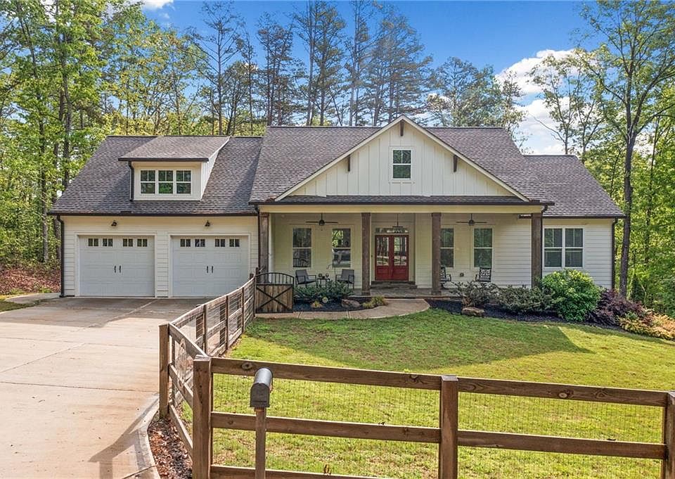 Charming Farmhouse Retreat Near Downtown Ball Ground. Tucked away on a serene and private 1.55-acre lot, this beautifully maintained farmhouse offers the perfect blend of country charm and modern convenience—just minutes from Downtown Ball Ground. Built only four years ago, this home features an inviting open-concept layout, ideal for both everyday living and entertaining. The chef’s kitchen is a dream come true, complete with quartz countertops, a center island with seating, stainless steel appliances, a cooktop, and a pot filler for added convenience. The adjoining dining and living areas are bright and spacious, centered around a cozy fireplace and flanked by a custom built-in that add warmth and character. The generously sized owner’s suite includes a spa-like en-suite bathroom with dual vanities, a large, tiled shower, and a luxurious soaking tub. Two additional bedrooms share a full hall bath, perfect for family or guests. Step outside to a covered back porch with its own fireplace, overlooking a private, fenced yard—an ideal space for outdoor living and entertaining. The walk-out basement is currently unfinished, offering endless potential for customization or ample storage. Enjoy the peace and quiet of country living while staying close to everything you need—highways, local restaurants, shopping, and even a winery just down the road. This is your chance to own a modern farmhouse oasis with all the charm and convenience you’ve been looking for.