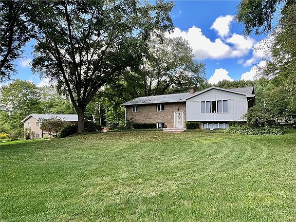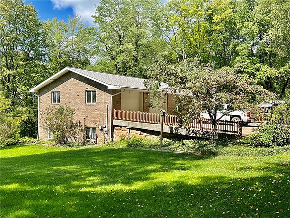 This 3 bedroom/2.5 bath sits on a beautiful 4 acres. The large yard is complete with an inground fenced pool, a koi pond and a lovely covered patio area with a porch swing. There is a 2 car integral garage and an additional over sized 2 car detached garage. The detached garage has a 2 bedroom/1 bath apartment under it with laundry hookups. Apartment has separate driveway and parking area. There is a large outbuilding (approx 39x12.5) with additional covered space for storage attached (20.5x12.5). The large deck in the back of the home leads down to the in ground pool. Walkout finished LL has wet bar (bar stools included) and pellet stove. Master bath was remodeled in 2018. Spacious living room with vaulted ceiling and log burning fireplace. Gutter helmets on both house and detached garage. Property has 2 septic/1 well. Property includes 2 lots. Just minutes from I79 and also close to town.
