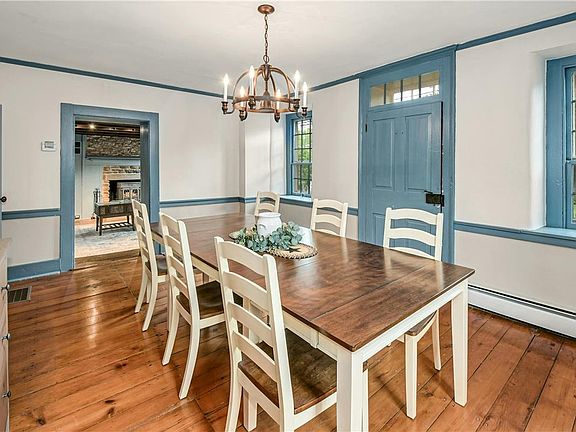 - Description: Pine steps at entry from living room; pine floor; crown molding; chandelier; chair rail; 3 windows with deep sills and rounded cheeks; painted wood door with knocker, transom, and screen door to front patio