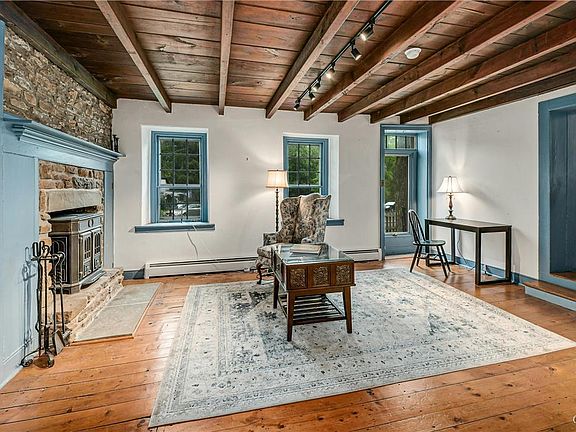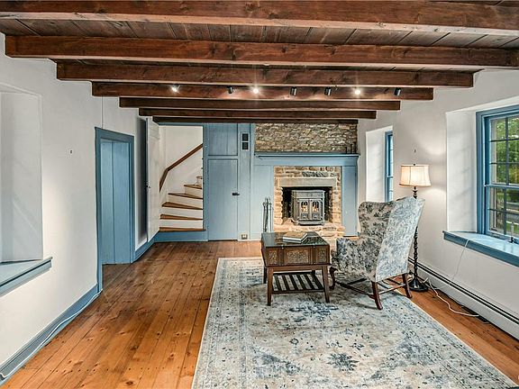 Set on 3.06 acres in Upper Bucks County, this circa 1846 stone farmhouse has been thoughtfully preserved and updated, seamlessly blending old and new in a picturesque country setting. Oak and pine floors, pie stairs, and deep-silled windows accent three levels of living space. A great room with vaulted beamed ceiling, floor to ceiling brick fireplace, built-in window seats, and wet bar is the focal point of the main level. Exposed wood beams and a wood insert fireplace enhance a living room with beamed ceiling and plentiful natural light. The well-equipped kitchen has a walk-in fireplace and pass-through to a convenient butler’s pantry and nearby powder and laundry rooms. Upstairs, the primary suite is spacious with a vaulted ceiling, three closets, skylight, and stone wall. Two additional bedrooms share a full bath on this level. A third-floor bedroom nook has quadruple windows, a vaulted ceiling, and built-in drawers. Entertain throughout the seasons with the sparkling in ground swimming pool and fire pit framed by extensive stamped concrete decking. A detached two car garage and classic red barn with folk art hex signs complete the grounds. Close to quaint towns and popular destinations along the Delaware River and Doylestown, the idyllic location is a 90-minute drive to Philadelphia and Manhattan. Nearby, the Lehigh Valley offers an array of festivals, shopping, and dining options.