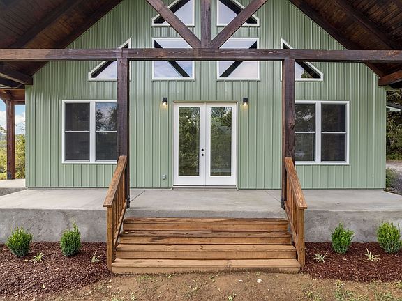 This charming 3 Bedroom, 2.5 Bath lakeview home blends rustic elegance with modern comfort in a serene, wooded setting. The exterior features a beautiful combination of green Metal siding, rich natural wood accents, and a sleek black metal roof. Its inviting covered front porch, supported by timber posts, offers the perfect spot to relax and take in the peaceful views.