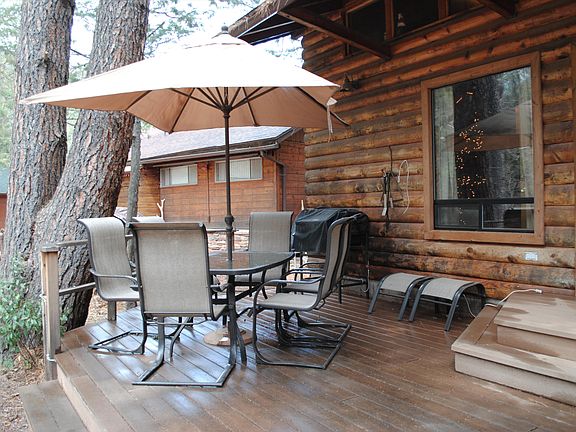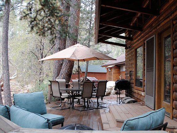 Charming and Cozy Cabin nestled beneath tall PINES, surrounded by the National Forest. Well built Log Sided Cabin overlooks Weber Creek. Expanded Deck and Firepit. Inside you'll find beautiful polished wood panel walls, a comfy kitchen with plenty of cabinets, fully furnished, including fridge, stove, trash compactor and microwave. The Majestic Fireplace (built from the stones of Weber Creek) puts out a ton of heat on those chilly Payson nights. The family room has lots of natural light with 2 HUGE picture windows AND clerestory windows to allow views from the loft area. Spacious master bedroom fits a king bed and the ''bunk room'' sleeps 6. Walk-in closet in bunk room provides lots of storage. Quiet and Peaceful cabin with great interim neighbors. Trails for hiking or riding close by. Detached garage fits 2 quads and all the tools. HUGE Propane tank. Lots of parking space. Culdesac lot. Horse properly near by.