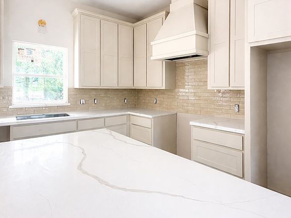 Designer tile backsplashLarge quartz islandCustom cabinetryOpen concept layoutLight filled kitchen