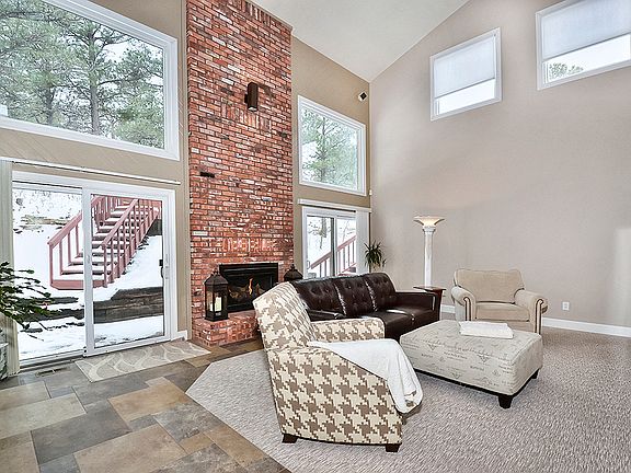 Fantastic Rockrimmon 4 bedroom, 3 bath home tucked in a cul-de-sac on just over 1/2 acre of land. Private and tucked with fantastic light and bright interior open floorplan. Updated kitchen with double wall ovens, range and walk-out to the deck from the kitchen, dining room and family room. Multiple decks (one with hot tub) offers huge outdoor living space. Soaring ceilings with floor to ceiling fireplace in living room. Formal dining table space in kitchen or ideal hearth room area. Main level master with attached bath, 3 bedrooms and bath upstairs, theater room in basement and great storage. Updated bathrooms, updated windows, central air.