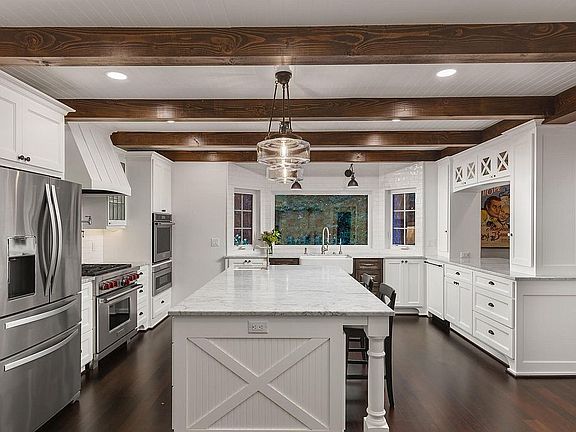 Extraordinary 1 acre, gorgeous waterfront gated estate with unparalleled craftsmanship. Completely remodeled top to bottom! Marvel with views in every single direction! Rare separate guest quarters with full kitchen! Relax peacefully in your west wing Master suite with outdoor access, sitting area, bath with heated tile floors, amazing triple head shower, soaking tub, and seperate his/hers walk-in-closet. Kitchen with two Fame sinks, double oven with dual fuel, oversized island, marble counters, bar seating, exposed beams, custom lighting! 17 skylights, dual climate, 3 fireplaces, and hardwoods through-out. Full basement that could be 5th bedroom or wine cellar! Enjoy every activity you desire, with outdoor sport court featuring night time lighting, home gym, media room, pool, sauna, hot tub, river activities, water sports, zip lining, gardening, and much more! 6 car garage with 20+ ft ceilings featuring kitchenette, entertaining space, and room for a lift! Cantilevered deck over looking the river with ample space to enjoy the peaceful night, grill or chat with friends. Exquisite, rare private resort!