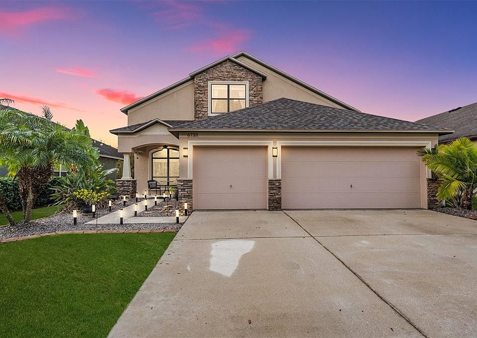 MOTIVATED SELLER $5,000 TOWARDS CLOSING COSTS! This home also qualifies for an ASSUMABLE HOME LOAN (VA only)! Welcome to 6721 Boulder Run Loop Circle, Wesley Chapel – with its notable functionality in this stunning 4-bedroom, 3-bathroom residence spanning an impressive 2,704 square feet. This home has a NEW ROOF installed in 2023 with solar attic fan and fresh new paint in May 2024! Nestled on a desirable conservation lot, this home offers the perfect blend of privacy and natural beauty. As you step inside, you'll immediately appreciate the meticulous attention to detail and thoughtful upgrades that make this home truly special. The extended tile flooring sets the stage for a seamless flow throughout the main living areas, providing a perfect backdrop for entertaining guests or enjoying quiet family moments. The heart of this home is undoubtedly the kitchen, featuring extended countertops and cabinets that cater to both form and function. Whether you're a culinary enthusiast or simply enjoy hosting gatherings, this space is designed to meet your every need. The open layout ensures that the chef of the family can stay connected with guests in the adjacent living and dining areas. With a loft upstairs, this home offers flexible living space – ideal for a home office, playroom, or additional entertainment area. The possibilities are endless, and the versatility of this design allows you to tailor the space to suit your unique lifestyle. The downstairs primary bedroom provides a retreat within your own home, offering convenience and comfort. Imagine starting your day in a serene atmosphere, surrounded by the tranquility of the conservation lot just beyond your window. In addition to the well-appointed interior, this residence boasts a 3-car garage, providing ample space for vehicles, storage, or even a home gym. Practicality meets luxury in every aspect of this property. Step outside to the backyard oasis where the conservation lot ensures privacy and a connection with nature. Whether you're enjoying a morning coffee on the patio or hosting a barbecue with friends, this space is designed for outdoor living at its finest. A blank canvas allows for your personal backyard oasis design to take place! Last but not least...the HOA is just $114 for the entire year! This home is located about 15 minutes away from KRATE, 40 min north of Downtown Tampa, 45 min. from Tampa International Airport, and 80 minutes from Orlando and Walt Disney World. Don't miss the opportunity to make 6721 Boulder Run Loop Circle your new home. Schedule a showing today and experience the perfect blend of serene living, thoughtful design, and the tranquility of a conservation lot. Your dream home awaits in Wesley Chapel! This home qualifies for an ASSUMABLE HOME LOAN (VA only)!