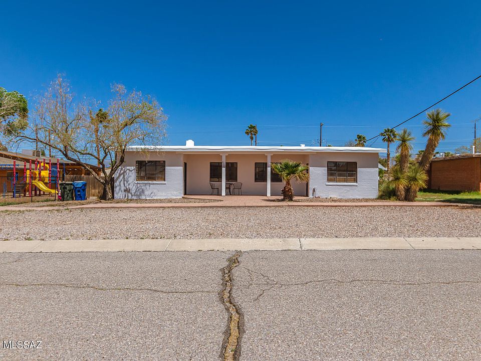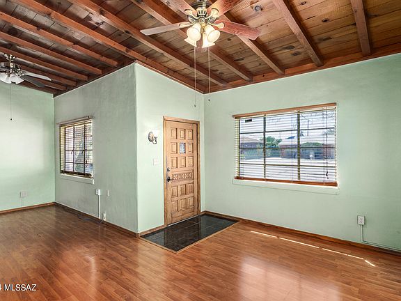 Looking for a place to call home? This single-level residence in Tucson is the one! Be greeted by a welcoming front porch where you can enjoy evening chats. Wood-look & tile flooring, designer paint, window blinds, and exposed ceiling beams are worth mentioning. You'll find a combined living/dining room and a formal family room paired with a wood-burning fireplace ideal to keep you warm during those cooler months. Continue onto the kitchen equipped with built-in appliances, a pantry, honey oak cabinets, and a breakfast bar. The main bedroom offers plush carpet and a private bathroom. Don't miss the guest's quarter with a separate entry. Oversized backyard has a storage shed and alley access with an RV gate. This one won't last long! NEW ROOF!!!!