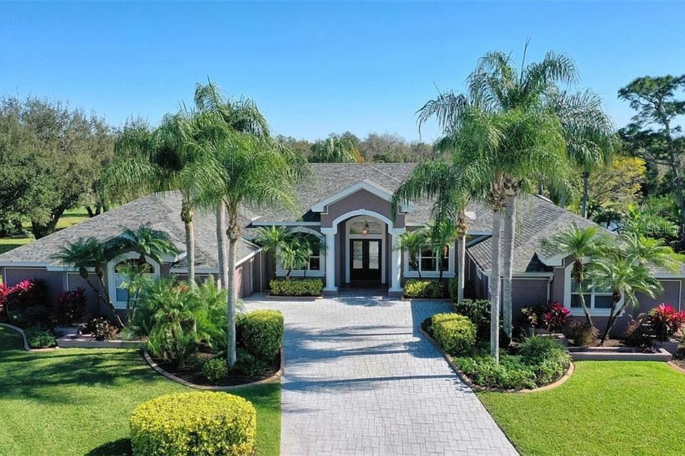 Overlooking its own scenic pond and verdant golf course views, this dazzling six-bedroom home on 1.5 acres is in a class by itself. Nestled on a quiet cul-de-sac in the River Club, the home is perfectly designed for entertaining and everyday life. Built by Arthur Rutenberg, the custom residence reveals elegance and comfort from the moment you step inside the double etched glass doors. 12' ceilings, built-ins, tile floors, and a wealth of natural light set a captivating stage. Take your pick of places for setting a table, from festive in the formal dining room, or casual in the eat-in café, or serene in the outdoor kitchen, or quick and cozy at the breakfast bar. Cooking is a delight in the gourmet kitchen, complete with granite surfaces, two ovens, wood cabinets, and center island. There is room for everyone, including an in-law suite with separate entry. The master suite boasts a regally-sized bath with soaking tub and walk-in shower. The finishing touch is the outdoor living area, screened for comfort and including a sparkling lap pool. Lounge on the paved lanai or host a get-together in the covered entertaining area. The roof was replaced in 2017. The home also has a well. The spacious two-car garage with 3 separate storage closets can be converted into a four-car tandem garage. The River Club is a friendly golf neighborhood and is centrally located to all the amenities of Lakewood Ranch.