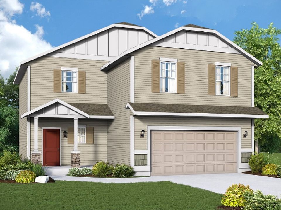This two story floor plan features shake accents at garage and stone accents at the columns of the covered front porch with 12 x 10 back concrete patio. Main floor includes 9 ft ceilings throughout, an open floor concept from the family room, dining room and kitchen, and a half bathroom. Kitchen features 42in upper cabinets, an island with eating bar overhang, Moen stainless steel pullout faucet, stainless steel appliances, and a pantry. Second floor includes a loft area, all three bedrooms, a guest bathroom and the laundry room for added convenience. Master suite features a walk-in closet and full bathroom with double sinks, 5 ft fiberglass shower, and a linen closet.