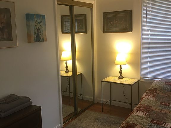 Private room, full bed, table, chair, dresser, 2 side table, 2 lamps, bedding, mirror doors, closet, 2 windows, hard wood floors, 3 area carpets, shared bathroom, street parking bnb style No smoking, No party, No loud music, Be generally respectful, clean up after your self, No Pets, We accept reusable tenant screening reports