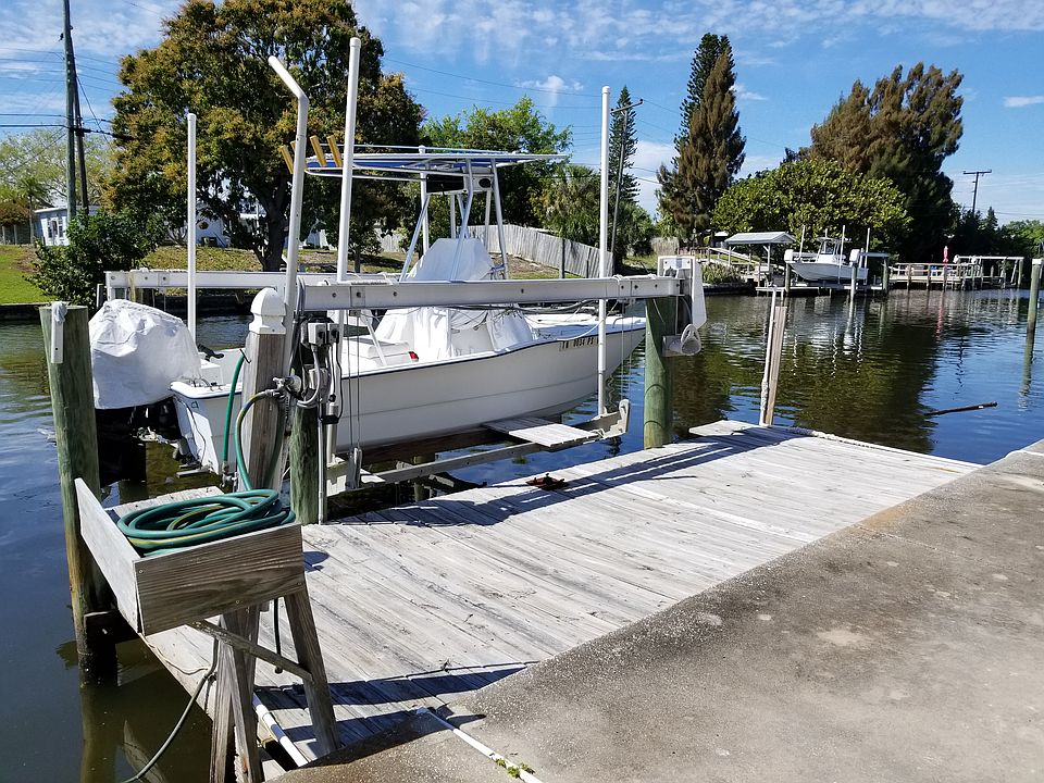 Beautiful home located on the canal with boat lift. Attached one and a half car garage. Home has 2 bedroom, 2 bath, office/den space which could be turned into 3rd bedroom. Living room, dining and kitchen all open space approx. 18x22 ft. Updated appliances include dishwasher, refrigerator, washer and dryer. Master bedroom has jacuzzi tub. Outdoor water feature. Access to heated outdoor swimming pool, hot tub, fitness center, activity room, shuffleboard court, wood working shop, bocce ball, beach area and access to boat marina.