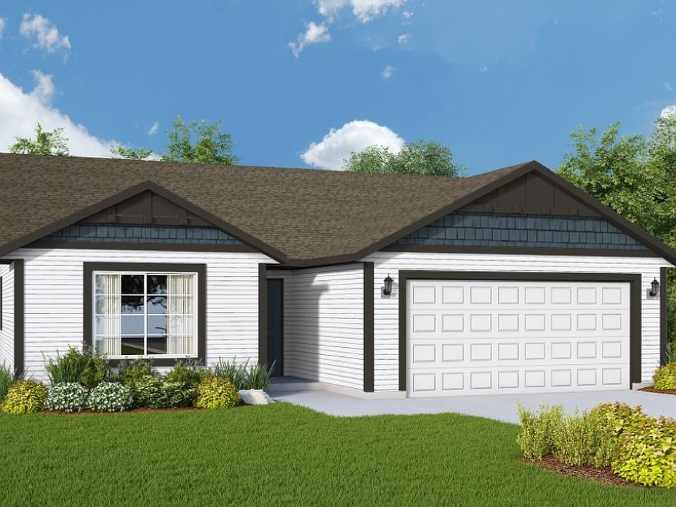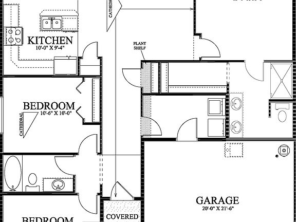 This rancher plan features covered front porch and cathedral ceilings that run through the family room, dining room, kitchen and one guest bedroom. Open floor concept from the family room, dining room and kitchen. Kitchen features 42 in upper cabinets, an island with eating bar overhang, Moen stainless steel pullout faucet, stainless steel appliances, and a pantry with plant shelving above along the hallway. Master suite features a walk-in closet, and full bathroom with double sinks and 5 ft fiberglass shower. Full guest bathroom between guest bedrooms.