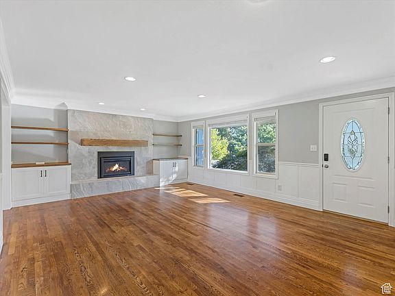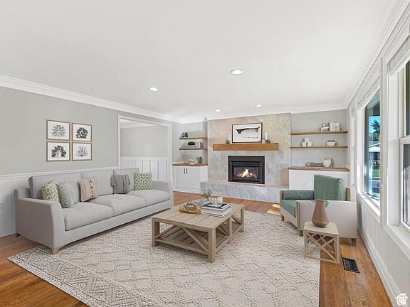 Welcome home to this beautifully updated rambler, perfectly positioned to take in sweeping east-facing mountain views. The inviting main level features a freshly painted interior and an updated kitchen with quartz countertops, subway tile backsplash, and stainless steel appliances. The spacious living area flows seamlessly to a large deck overlooking the fully fenced backyard, shaded by mature trees-ideal for entertaining and everyday living. Downstairs, a separate entrance provides flexible living options, while thoughtful updates throughout the home offer peace of mind. Recent renovations include a reimagined primary suite shower, an updated fireplace with custom built-ins, remodeled bathrooms, and upgraded systems such as a newer roof, sewer line, furnaces, radon system, and more. Brightened basement with newer windows, new carpet, and modern touches like smart home features add comfort and convenience. Located just minutes from Big and Little Cottonwood Canyons, top-rated schools, parks, and popular dining spots, this home blends style, functionality, and location in one perfect package.