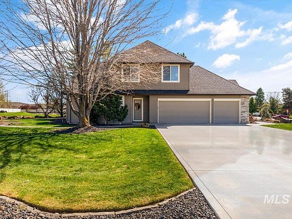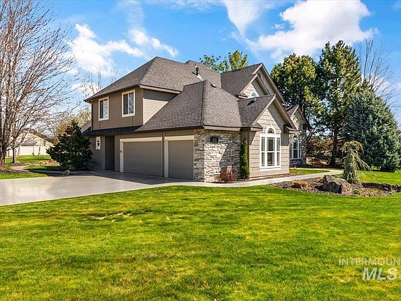 Vision living on one acre while just 20 minutes to prime locations in the valley - downtown Boise, Micron, Boise Airport, and the Village at Meridian. Nestled within a peaceful enclave of acreage homes, this 1.09-acre property provides a tranquil escape with beautifully maintained landscaping. You'll find plenty of space for your hobbies and adventures, including a 500-square-foot shop and RV parking. The property features pressurized irrigation ensuring your lawn and garden stay lush and green. Step inside this fully updated, move-in ready home and be greeted by expansive living areas bathed in natural light. The great room's soaring ceilings create an open and spacious atmosphere. The main level includes a primary en-suite bedroom and a large, private office space. Upstairs, you'll find three additional bedrooms (one large enough to serve as a bonus room) and a bathroom. With a newer HVAC system, you can enjoy modern comfort and energy efficiency year-round.