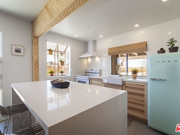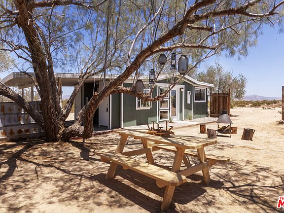 Newly completed and furnished with a detached garage/studio this is the quintessential cabin in the middle of nowhere, ready for a new owner to drop their bags or Airbnb. Located in north Joshua Tree, close to BLM land. The new kitchen has quartz countertops, a SMEG fridge, garbage disposal and new electric oven. Bathroom has floating vanity and cement tile floor. The freestanding wood stove is in place, piping is on site and ready for the new owner to easily hook up. The home has individual wall heaters per room and a swamp cooler for the main house with a separate AC unit for the master bedroom. The detached garage is divided into a garage and studio. It has water/power running to it (buyer to check) and is tied into the existing septic (buyer to check). This structure could make a great guesthouse, studio or storage space. Outside, there's a charming fire-pit area, two patios and an LG stackable washer/dryer. Includes keyless entry, lockable owners closet and ADT alarm system.