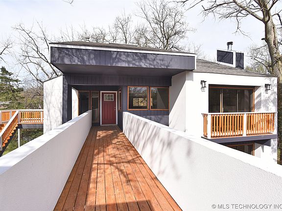 Check out this incredible and private contemporary home. In Jenks School district! This remodeld home offers an excellent floorplan for the entertainer and utterly Fabulous outdoor spaces. Enjoy the views of your trees, stream and yard from your balcony, deck, or patio. Detached garage and super cool covered walkway. Updated and Ready for you! Come check it out!