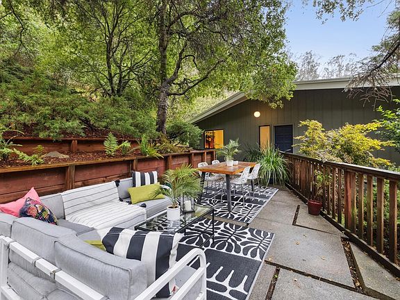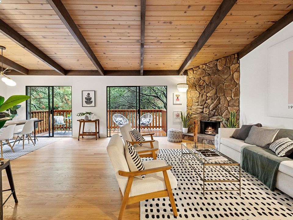 Surrounded by redwoods and beautiful oaks, this upgraded 3BD/2.5BA Montclair home is now transparently priced! The 1709 SQFT home welcomes you with a spacious terrace where you can unwind or entertain encircled by majestic trees and a terraced garden. Step inside the home’s open living area that compliments the setting’s natural beauty with a soaring beamed ceiling, a statement stone fireplace, and two sliding glass doors onto a new deck that spans the living and dining area. The adjacent stylish kitchen, the open floor plan, and wide deck offer seamless flow and indoor/outdoor living. New hardwood floors continue down the hall featuring a full bath with tub, one bedroom with a garden picture window, and a bright primary bedroom with an ensuite bath. Both bedrooms enjoy roomy closets and new recessed lighting. Downstairs find another private bedroom, half bath, laundry room, and indoor access to the oversized 2-car garage. Venture out the side door to relax or play on the newly refurbished back patio with pavers and raised garden beds. This wooded sanctuary is close to top-rated public schools, the Montclair Swim Club, and lively Montclair Village for shopping and dining; and East Bay Parks for recreation with miles of beautiful trails.