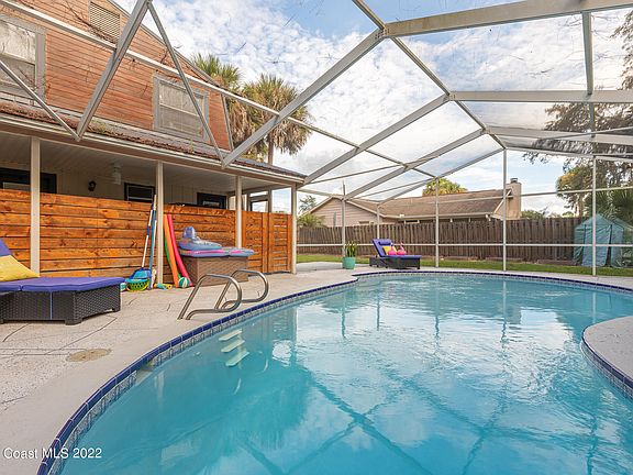 Welcome to your charming and lovingly updated four bedroom, Salt Water pool home on the Space Coast. Located just across the water from Kennedy Space Center, your family can float in the pool while you watch the launches! This home boasts a 2019 metal roof and brand new Lennox AC. Recent updates to the home include interior and exterior paint, fence, patio, landscaping, and upstairs flooring. Your outdoor oasis has newly resurface and tiled pool with new salt system. The yard includes garden beds and custom built playhouse. The exterior breaker box, dishwasher and ring door bell are other recent updates. Indoor and outdoor furnishings are negotiable.