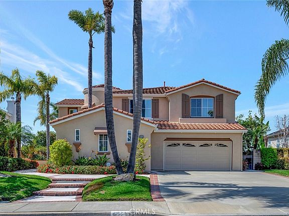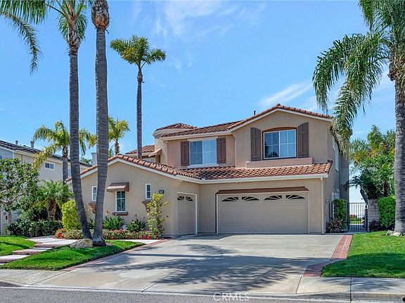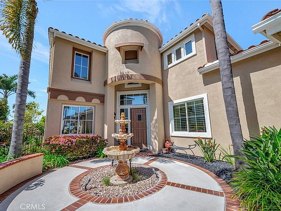 Rare and extraordinary Mariners Point cul-de-sac home with panoramic, unobstructed Ocean Views. Nestled on a flat 10,000+ sqft. parcel, with towering palms validating your arrival to something special! Manicured grounds lead to a cascading water fountain and turret style entry. Over 3,300 sqft. of luxury costal living, with oversized 3-car garage. Desirable open floor plan, 4 spacious bedrooms & 2 full baths upstairs plus a large office and 3/4 bath on the first floor. Volume ceilings, crown moulding, custom window coverings and harmonious porcelain tile & carpet throughout. Beautiful Blue Pacific view from living room, dining room, kitchen, family room, master bedroom, balcony and resort-style grounds. Culinary island kitchen features double ovens, rich black granite countertops, abundant white cabinetry and storage, built-in refrigerator, and all the extras you would expect. The ambiance only a fireplace can create can be found in the living room and family room. Well-designed master suite and adjoining bath featuring; walk-in closets, duel vanities with black granite counter tops, deep soaking tub with black granite boarder, large man-sized shower, separate water closet, and of course an ocean view. Entertainer's dream yard, designed and manicured for fun!, brick-laced concrete patio, built-in BBQ, herringbone brick walkway, and a beautifully crafted patio structure to complement this unobstructed ocean view property. This property will sell fast! Note 4th bedroom is exercise room.