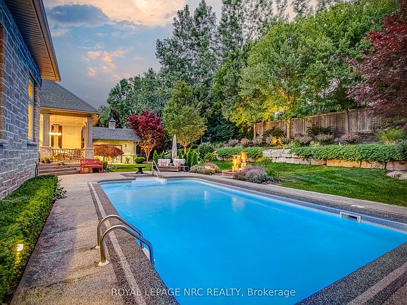 Prepare to be amazed the moment you step through the grand, upgraded solid mahogany door of this remarkable open-concept bungalow. Nestled on a tranquil cul-de-sac in Niagara's prestigious Calaguiro Estates, this 2,740 square foot home exemplifies luxury living with premium finishes, meticulous craftsmanship, and professionally landscaped grounds with an irrigation system. Designed for culinary excellence, the gourmet chef's kitchen is paired with a dedicated prep kitchen, offering unparalleled functionality for those who love to cook and entertain. The expansive living and dining area is adorned with an impressive stone gas fireplace, striking 26-inch crown mouldings, and oversized sliding patio doors that open to a secluded backyard retreat. Here, you'll find a heated saltwater pool and a stunning portico, an idyllic setting for outdoor gatherings and relaxation. The luxurious primary bedroom boasts a custom walk-in closet and a spa-inspired five-piece ensuite finished with elegant travertine and hardwood flooring (under the carpet). An additional bedroom, main floor laundry, central vacuum system, and a hidden loft room provide extra space, comfort, and convenience for everyday living. Downstairs, discover a media room, exercise room, and office, most basking in natural light from oversized windows. The lower level also offers the potential for a complete in-law suite, featuring a spacious five-piece ensuite bathroom and a private entrance, making it ideal for guests or extended family. Completing this extraordinary residence is a triple attached garage, seamlessly blending functionality and style for the ultimate in refined living. Pre-Inspection report just completed.