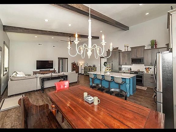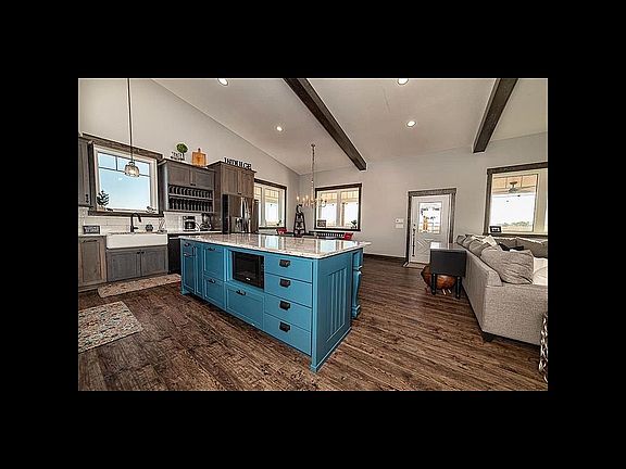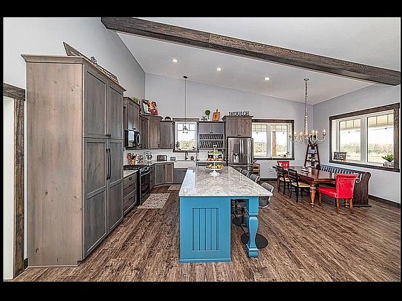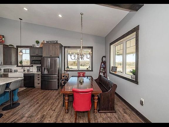 Nostalgic, custom red barn home w/ stunning views in quiet country setting. Modern interior features 10' elevated ceilings, Quartz counters with a spacious kitchen island, black stainless appliances & LED energy eff. lighting in a solar powered home. This handicap accessible home includes a stunning 4950 sq. ft Multi-Sports Gym w/ radiant heating, breakaway reg. bball goals. F-5 Tornado-rated shelter and extra 24’x42’ shop. Additional land available with pond.