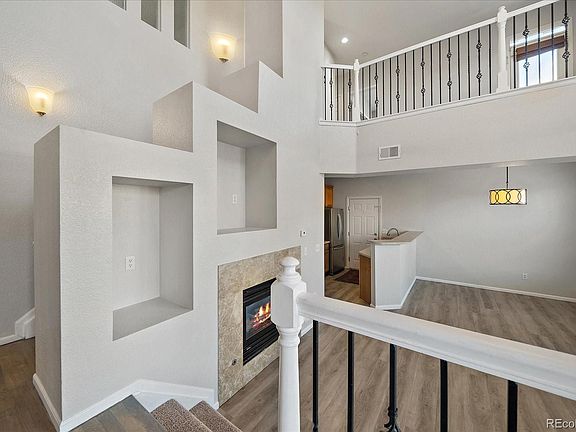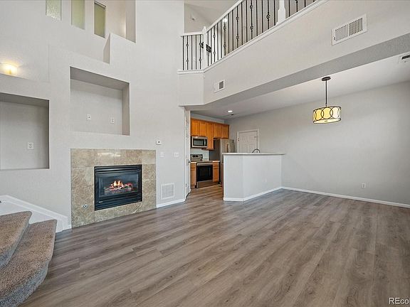 Incredible opportunity in the highly sought after Saddle Rock East community! This 2 story end unit townhome is gorgeous and move in ready! Open and vaulted floor plan. Private entrance. spacious family room with laminate flooring, gas fireplace and built in entertainment niche. Very nice kitchen and dining area with all appliances and huge pantry. Central Air and ceiling fans. 1/2 bath on main floor. Very nice master bedroom with 5 piece bath and walk in closet. Upper floor laundry. Loft area ideal for home office or playroom. 2 car garage. Balcony area. Great location close to Southlands, E470, Trails, and easy commute to DIA. Community pool , Do not let this one get away!