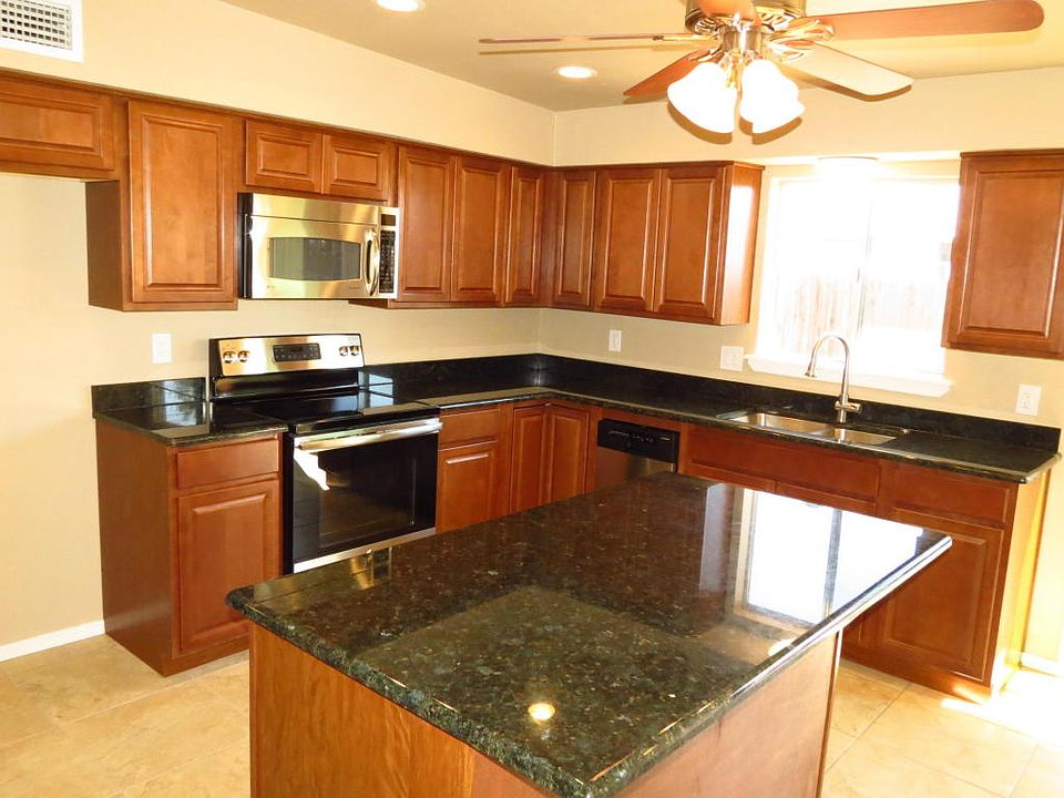 3 BEDROOMS 2 FULL BATHS. New kitchen with new sit down island w/outlet. New cabinets,granite counter tops,flush mount kitchen sink, stove,microwave, garbage disposal w/inlaid counter switch & dishwasher.New recessed can lighting.New contemporary tile floors. New carpet and mirrored wardrobe doors. New six panel doors through out.New window sills.New door trim & base boards. Fresh exterior/interior Behr premium paint. New lighting & fans. New switches & plates. Large laundry room. Extra long private drive way with carport. NO HOA dues! 2 full baths with new vanities, mirrors,inlaid medicine cabinets and lighting. New side yard fencing. Lots of storage!