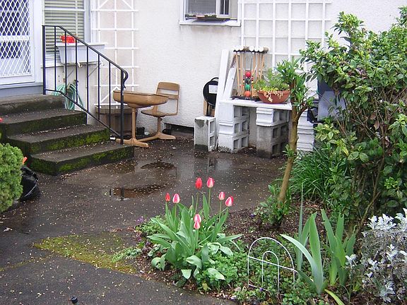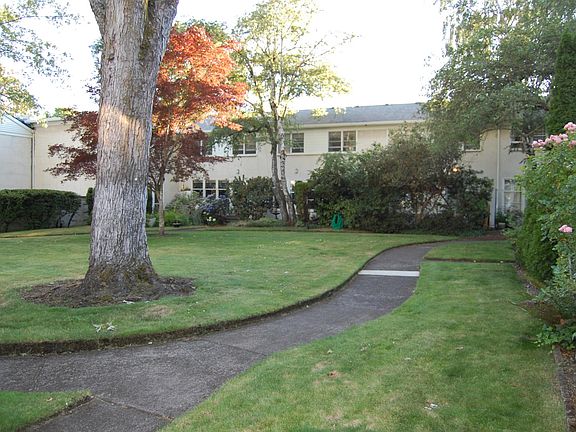 The Binford is a classic Portland complex, designed by a woman architect and built in 1946, a time when good craftsmanship meant something. It is well known among Portland architects and landscape architects for its glorious courtyard and well-designed living spaces. The courtyard is truly amazing -- professionally maintained lawns with 100-year-old fir trees, flowering cherry and crabapple trees to brighten your springtime, and birds to sing you awake in the morning. The courtyard is open to all residents and their guests but can only be accessed through someone's apartment, so very private and safe. The Binford buildings are in the townhouse style, with bedrooms and bathroom upstairs and kitchen and living areas downstairs--no one walking over your head. The interior features beautiful hardwood floors (red oak) throughout, large floor-to-ceiling windows, ceiling fans in every room, and closets you won't believe (female architect, remember). Kitchen has all the standard appliances, including a new stove, plus microwave and dishwasher. The main living area is one large room, with an obvious delineation between the dining area and the living room area. Just outside the living room is your own private patio, opening to the wonderful courtyard. Super-convenient location, close to the Banfield, lovely city park and golf course, to shopping and restaurants, and NE Portland's newest food cart pod. This apartment was once my own home, and I am dedicated to maintaining it in top condition. Month-to-month rental, with 30-day move-out notice required. Due at signing of rental agreement: first and last month's rent, plus $750 security deposit. Your rent includes heat, water, hot water, sewer, and garbage collection. Does not include electricity, telephone, cable, or wi-fi. However, internet and cable connections are in place. Pets allowed: 1 cat. No smoking allowed. You would have an assigned space in an off-street parking lot. Recycling station on site. Clean and bright laundry room in basement; coin operated..