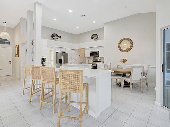 Welcome to your vibrant Naples retreat! Situated in the charming Berkshire Lakes neighborhood, this delightful pool home at the end of a serene cul-de-sac is your ticket to an unforgettable short-term stay. The pool and pool deck face south. Dive into fun with the heated pool and complimentary beach gear, including two brand new bikes for exploring the area's treasures. The main bedroom features a king-size bed along with a sprawling en-suite bathroom with direct access to the pool. The second bedroom, which faces the front of the home, features a queen bed. Lastly, the third bedroom, a converted den, is centrally located within the floor plan and has a queen bed with a trundle that pulls out from underneath. Inside, you'll find a variety of dining spots: pull up a seat at the kitchen counter with its bar chairs and four-top dining set, or gather around the dining room table, which comfortably accommodates six. Prefer to dine outdoors? There's a spacious outdoor set-up with a six-seater round table under the roof, and for a laid-back vibe, relax on the poolside chaise loungers.