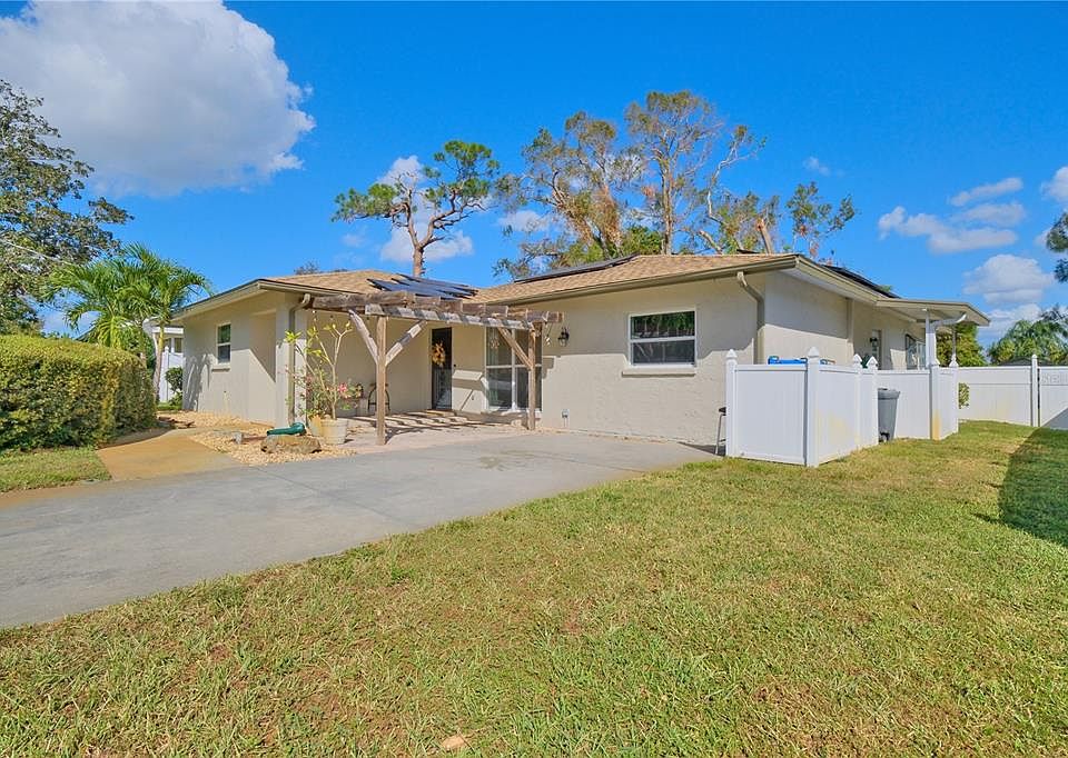 Fantastic 4-bedroom home with many updates including NEW ROOF in April 2024, OPEN, UPDATED KITCHEN with stone countertops, engineered hardwood flooring throughout with tile in kitchen and baths, which are also updated. All bedrooms have generous walk-in closets, too! Modern amenities include (20) SOLAR PANELS reducing electric and hot water bills and insurance!! Newer, double paned windows to name just a few. The gorgeous, spacious lot with shade trees and mature landscaping is perfect for your furry family members or extra space for family fun. Need some work space? NO HOA/NO DEED RESTRICTIONS, here, so don't miss the single-spaced garage in the back built on a slab - perfect for hobbies or extra storage. The attached garage has been renovated to a large, 4th bedroom with a walk-in closet (permit on file). You'll love the whole-house water filtration system, roomy laundry and mudroom with extra storage space, and split bedroom floor plan. Home is located on near end of a very quiet street and just blocks away from the Sara Bay Golf Course and Country Club. It's Apx.15 min to Lido Beach and about 30 min from downtown Sarasota! Dining and shopping is within minutes. In the wonderful 'FLOOD ZONE D" area - sleep easy! Hurricane tested - NO house structure damage! NO water intrusion! A home this nice and sound won't last long, so schedule your showing today! Washer does not convey with the sale (only the dryer).