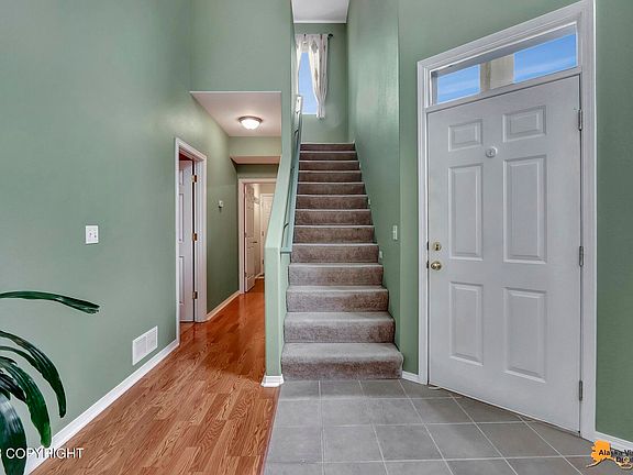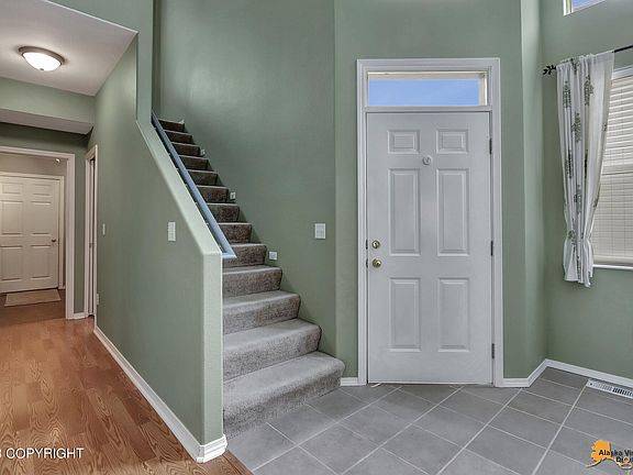 Great room concept, with master on main level. Master is ensuite with two walk-in closets. Fenced yard and deck. Tiled entry to laminate wood floors downstairs and carpet upstairs. Solid Surface counter tops. Close to midtown, airport, and Kincaid Park and trails.