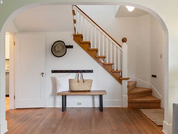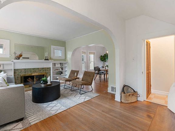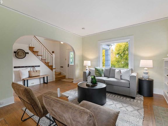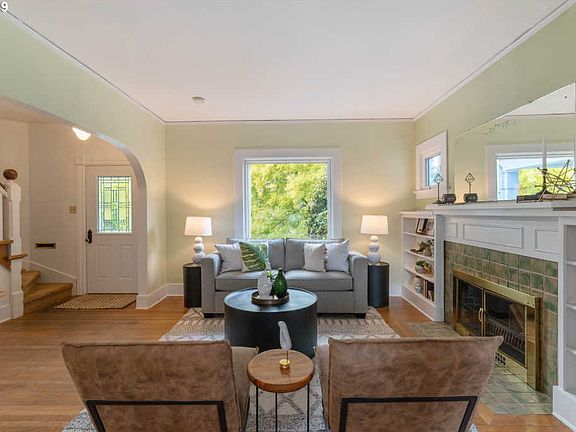 This lovely 1894 Victorian is just so charming. Light filled rooms, tall ceilings, bullseye molding. Super cute retro kitchen plus main floor office/nook and half bath. Three bedrooms up plus remodeled full bath w/ penny and subway tile. Unfinished basement has great potential. Wraparound porch and beautiful backyard w/ alley access. Many new systems and features. Fabulous location on tree lined street one block from Willamette Bluffs! [Home Energy Score = 8. HES Report at https://rpt.greenbuildingregistry.com/hes/OR10013363]