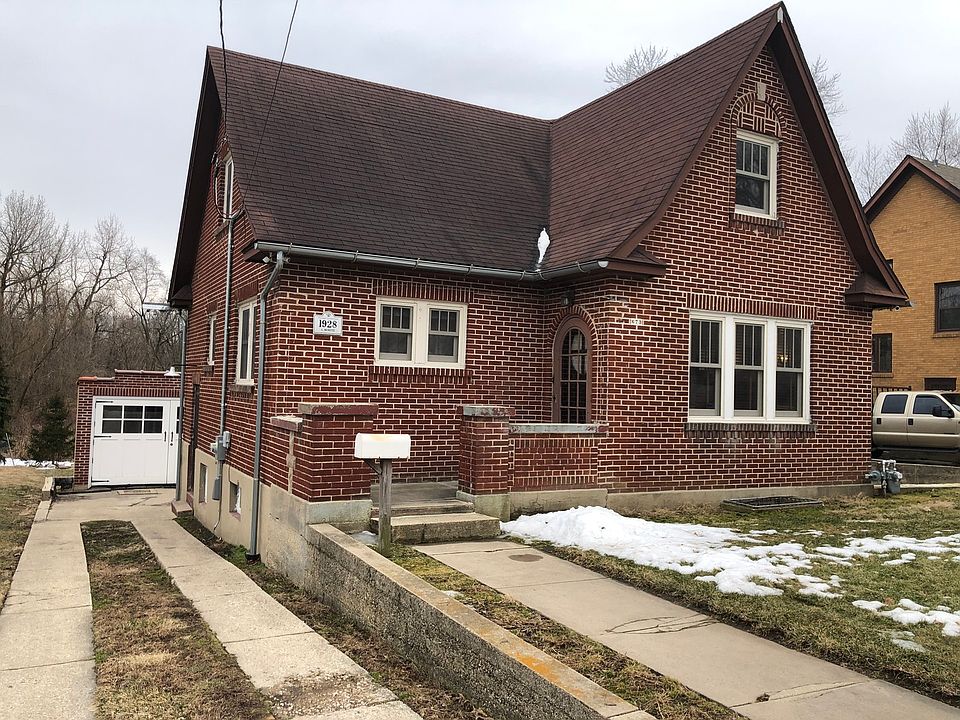 English Tudor. Built by Mr. A. Moritz from Germany. Completed in late 1928. Home has natural woodwork and hardwood floors. Living room with decorative plaster crown molding and ventless fireplace flanked by leaded glass windows. Vintage eat in kitchen with original refinished wood cabinetry, farmhouse sink and casement window. Updated bath with ceramic subway tile and octagon floor tile, new vanity sink and Toilet, original claw foot tub.