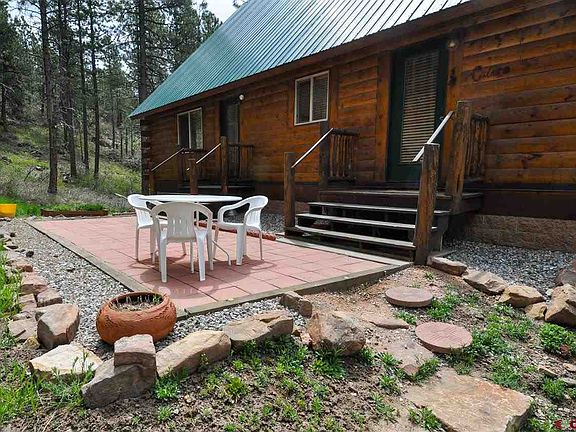 Enjoy the tranquility of this quintessential Colorado log home in Forest Lakes surrounded by tall pines and serene mountain views. The patio to the back of the home is a great area for outdoor entertaining. From the patio, there are two rear entrances to the home. One door enters into a pantry/mudroom off the side of the kitchen and the other into the main level living area. Large windows bring the outside in and illuminate the open living area which has vaulted ceilings and laminate wood floors. To keep the room even more comfortable in the cold months the room features a pellet stove. The kitchen is open with ample counter space and pine cabinetry. Two of the three bedrooms are found on the main level, one with direct access to the covered deck which is also accessible via the living area. The master is upstairs with a full en suite bathroom. A walk -- out finished basement functions as a family room with a full bathroom and access to the spacious 2 car garage.