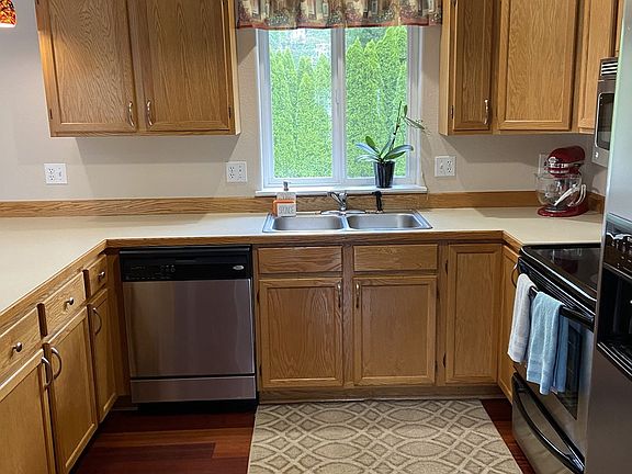 Beautiful home w/ Vaulted Ceilings, Gleaming Hardwoods, New Baseboards/Trim, Bay Windows, Updated Kitchen & Baths, Stainless Appls, and New Fixtures. Ductless HVAC. Lower level great room incl. Bay Window, Propane Fireplace, Full Bath, Closet, and a potential 4th bedroom. Extra Deep Garage w/ Built-ins. Spacious Backyard w/ Lush Landscaping, Multi-level Deck w/ Stairs, Hot tub hookups, Covered Patio, and RV Parking potential. Great Shape, Professionally Cleaned & Move-In Ready!
