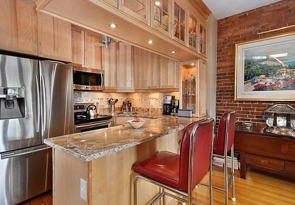 Enjoy the beautiful views of the South End and Back Bay skyline from this sun-filled one bedroom penthouse! The living room has hardwood floors, a wood-burning fireplace and is open to the kitchen. The renovated kitchen has light maple and glass cabinetry, under-cabinet lighting, a breakfast bar, and Kashmir stone counters. The stainless steel appliances include a microwave and a dishwasher. The large bedroom accommodates a king-size bed and has room for a home office area as well. The bathroom has a jacuzzi tub and includes a private washer/dryer (there is also a common laundry downstairs). The spacious roof deck is higher than surrounding buildings, resulting in particularly dramatic views. Conveniently located in the heart of the South End, it has an easy commute by foot to public transportation, shopping and the restaurants of the South End!