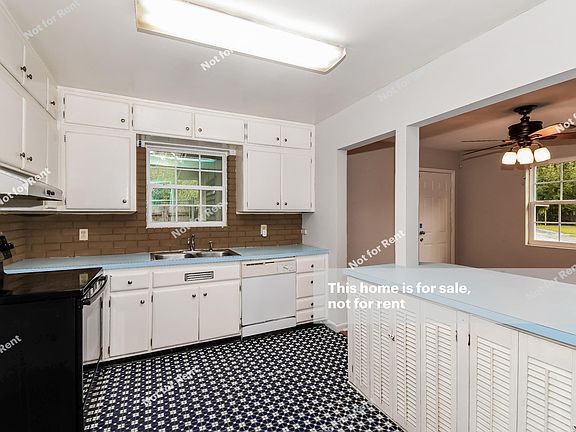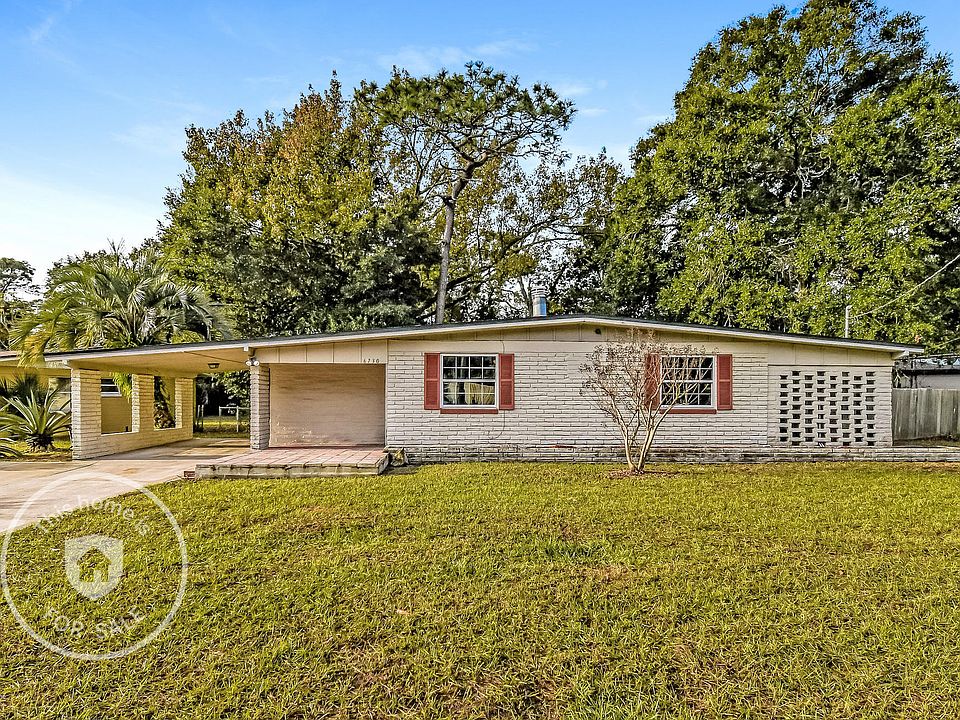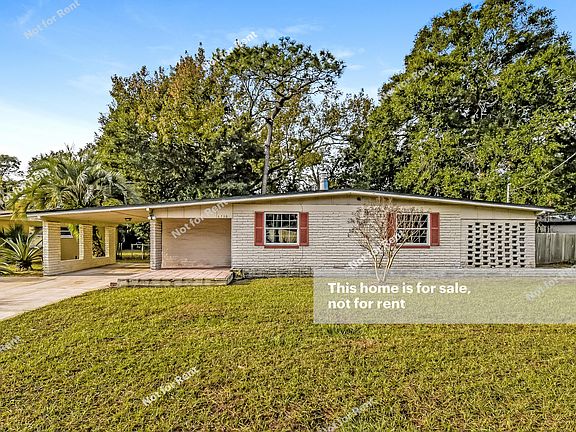 This Jacksonville one-story corner lot home offers tile and laminate flooring, a wood-burning fireplace, a den, and a one-car carport.