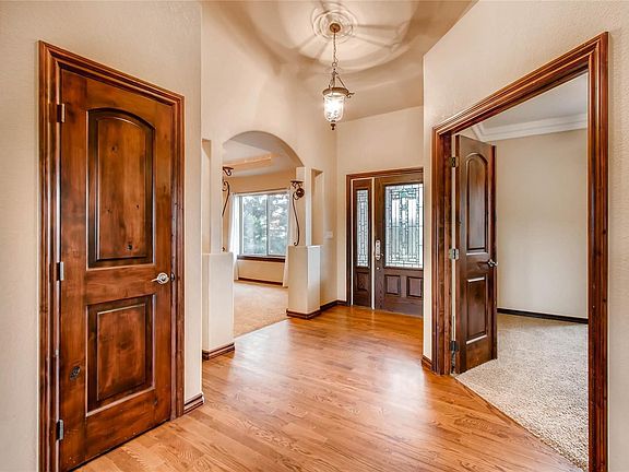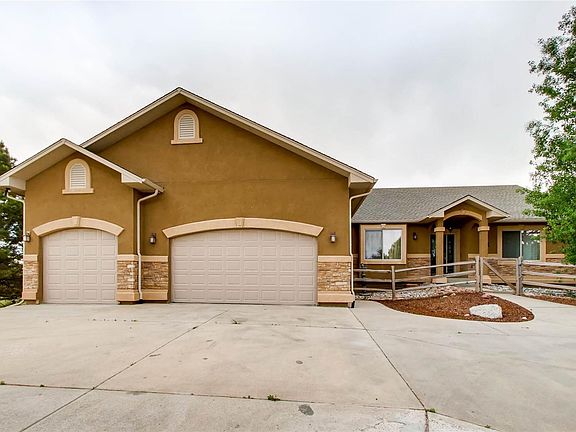 This 5 bedrooms, office, 3 baths, 3-car garage home offers upgrades everywhere! The custom home's location on a treed lot is only 15 mins from north Colorado Springs, 50 mins to south Denver & offers award winning D-20 schools! The home offers formal living & dining, upgraded ceiling tray & coffer details, granite countertops, upgraded cabinets & trim throughout, true laundry w/sink & storage, AC, 2 H2O heaters, 2 furnaces, alarm system, concrete driveway, & 44' foot long, 1/3 covered deck, no HOA & zoned for horses! Located on paved roads, plus paved drive, this country rancher has all the bells & whistles. Decor is warm wood w/ knotty alder doors & trim, raised panel cabinetry, granite throughout the kitchen & bathrooms along w/ granite tiles on bathroom flooring. Wood flooring flows from the entry through the kitchen & hallway. Upgraded plumbing & sinks throughout & huge secondary bedrooms. The layout has the unusual feature of a master, office, & secondary bedroom all on the main.