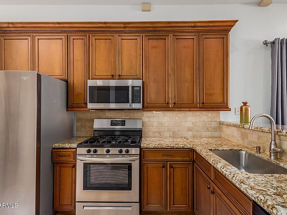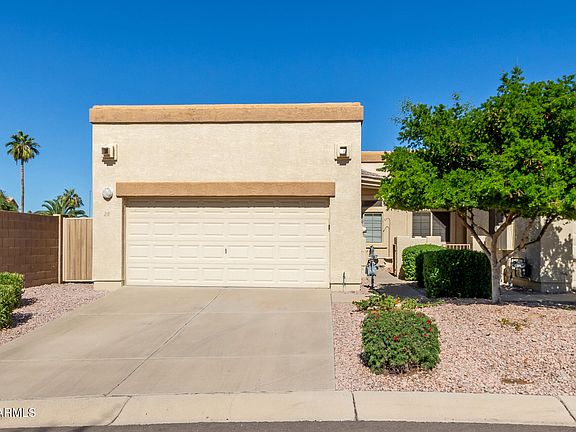 Premier gated community featuring all single level units. Bright and airy townhome bathed in natural light through 2 sky lights. Open concept living area flows seamlessly through sliding doors to private back patio. Kitchen features updated cabinets, fridge and granite countertops. Entertaining space includes elevated bar and great room dining. Large primary bedroom with 3/4 ensuite updated bath. Updated flooring throughout and vaulted ceilings. Overall aesthetic is fresh and inviting. This spacious townhome includes a 2-car garage. New hot water tank, softener, washer dryer 2024. AC replaced in 2021. Gorgeous community pool to enjoy the sun. Conveniently located near grocery stores, restaurants, shopping and medical offices. Only 20 minutes from Sky Harbor Airport.