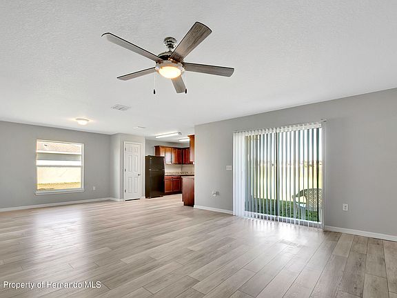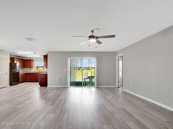The scenic vistas of Sherman Hills Golf Club serve as a serene backdrop for this exquisite 3-bedroom, 2-bathroom residence located on the 3rd Fairway. Set within this idyllic environment, the home provides a peaceful retreat while remaining conveniently close to shops, restaurants, and recreational activities. Upon entering, you are greeted by a spacious entryway that leads to the guest quarters, which include two bedrooms and a shared bathroom. The open floor plan features a generous living room with golf course views, a dining area, and a well-appointed kitchen. The kitchen boasts a pantry, cherry colored cabinetry with crown molding, a deep stainless-steel double sink, new stainless-steel stove and microwave, and elegant granite countertops. The master bedroom, distinct from the other sleeping areas, offers a private haven within the home, enhancing tranquility with its split layout. The luxurious en-suite bathroom includes a walk-in shower, cherry colored vanity, linen closet, and an expansive walk-in closet for added convenience. With the water heater, roof, and air conditioning system all being just seven years old, this property ensures reliability. Additionally, it is enhanced by new LVP flooring throughout and a freshly painted interior. For golf enthusiasts, having direct access to the course is an unparalleled advantage, allowing for spontaneous rounds of golf right from your backyard. The beautifully maintained fairways and greens create an inviting atmosphere for leisurely play, making every day feel like a golfer's dream. Its prime location provides easy access to I-75 and the nearby Withlacoochee State Trail, striking a perfect balance between comfort and convenience. Seize the opportunity to claim this remarkable home as your own; contact me today to arrange a private showing before it is no longer available. This property is eligible for ZERO down - 1st time homebuyers with our preferred lender.
