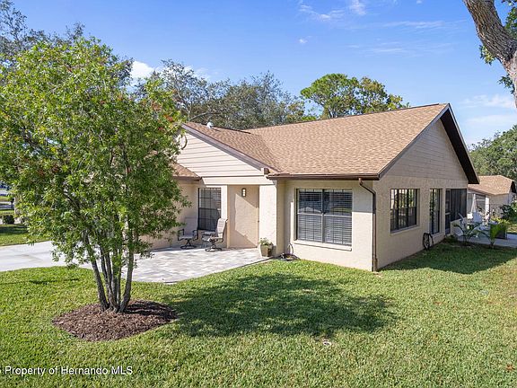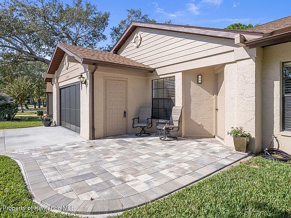 very private enclosed lanai. Off of the kitchen eat in area, is another entrance to the lanai that leads to the private outdoor patio for grilling. This 2/2/2 offers updated appliances, solid stone countertops, new flooring, a new roof 2025, new hvac 2025, garage door 2023, and the home has an area in the rear of the home for the golf cart. Located in a very active village within Timber Pines active 55+ community. The community offers 4 golf courses, new pickleball courts, a multimillion dollar fitness center. Tennis courts, 2 pools and hot tubs, 2 pro-shops, a driving range, a full time restaurant and a performing arts center.